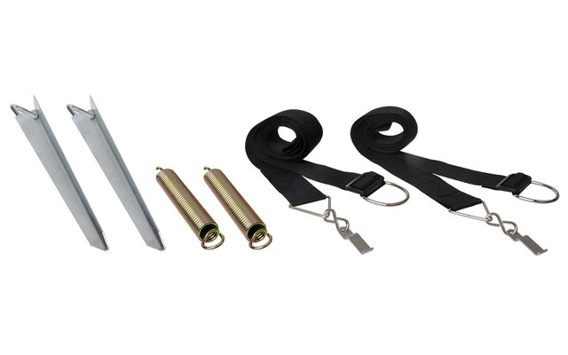 Im Lieferumfang sind 2 Gurte, 2 Stahlfedern und 2 stabile Heringe für ein perfektes Abspannen.