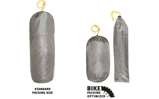 Das Packmaß ist handlich und für Bike Packing optimiert. Mit einer Packmaßlänge von 45 cm, passt das Zelt gut in eine Lenkerrolle. Der regenfeste Packsack kann, auch ohne Lenkerrolle, mit Klettbändern oder Riemen am Lenker befestigt werden. Der Packsack ist zudem in der Länge variabel. Durch das Herauslösen des Gestänges, reduziert sich die Packsacklänge auf 30 cm. Das Gestänge kann dort verstaut werden, wo es eventuell besser passt z.B. in einer Rahmentasche.